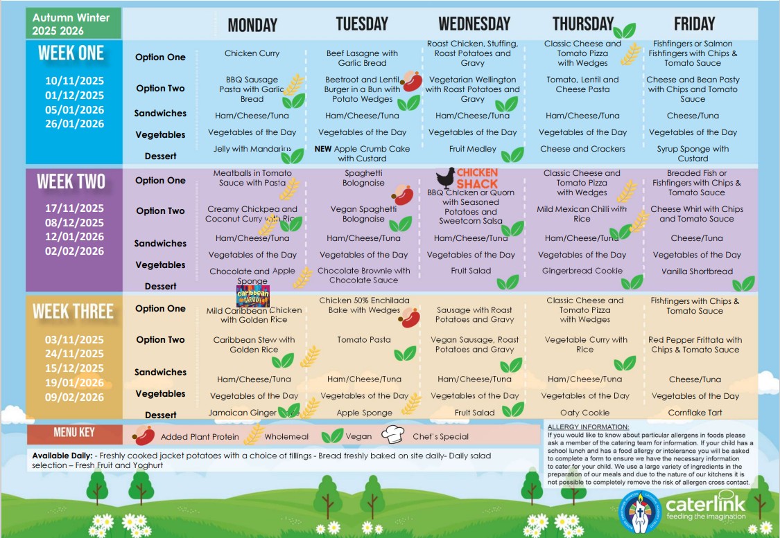 From September 2025 Blessed Christopher Wharton Catholic Academy Trust will be working with Caterlink to school lunches. The menus change twice yearly October to April (Autumn/Winter) April to October (Spring/Summer)